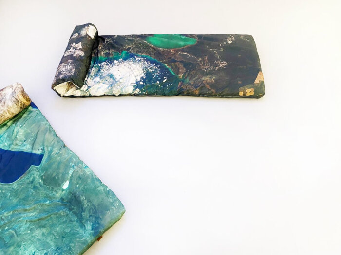 Navigation between the tangible and spiritual realms, as well as between nature and culture, and tradition and technology, is further explored in the work of the2vvo, a transdisciplinary artistic duo consisting of Lena Pozdnyakova (b. 1985) and Eldar Tagi (b. 1987). Their sound installation Presence (2024) delves into throat-singing, an ancient tradition of Inner Asia’s Indigenous peoples, recontextualizing it within a modern, globalized, and technologized framework (Fig. 12). Traditionally, throat-singing is a shamanic technique for communicating with the natural and supernatural worlds, a form of ‘sonic holography’ that reflects the interdependence between humans and their environment. The project utilizes another technology, Generative AI, to transform throat-singing, thereby further blurring the boundaries between the human and non-human and challenging anthropocentric views. The immersive sound installation also features rugs for listening, printed with satellite photographs of the rapidly shrinking Aral Sea, a site of lasting environmental catastrophe in Central Asia (Fig. 13; Fig. 14). In this way, the audience’s connection to the environment through ‘sonic holography’ that blends traditional and cutting-edge generative cosmotechnics, takes place in the contemplation of an actual ecological catastrophe. In the context of the current ecological crisis, the nuclear anxiety of the 1980s, as expressed by Tolepbay, seems remarkably relevant to more recent critiques of the Anthropocene, as exemplified by the work of the2vvo. The apocalyptic disruption promised by this crisis fuels artistic imagination, calling for a transformation of our way of life and our relationship with the environment.