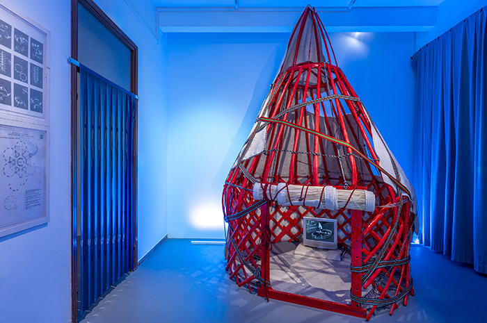 Narynov’s approaches may seem far removed from Maslov’s postmodernist, provocative irony, but both artists combined utopian and science fiction imagination with a revision of the yurt. This blending of pre-modern and futuristic elements for rethinking spatial identity is highly characteristic of decolonial futurism. By exhibiting their fantasies of mobile dwellings together, the curators suggest that the question of cosmic nomadism can be a central theme for Kazakh decolonial futurism.