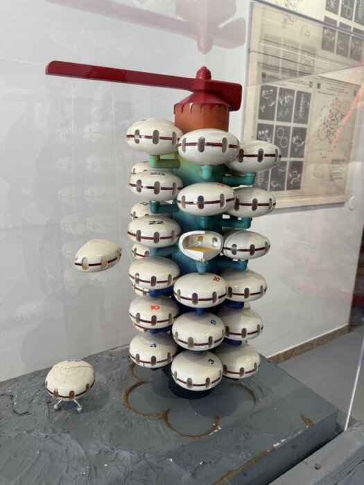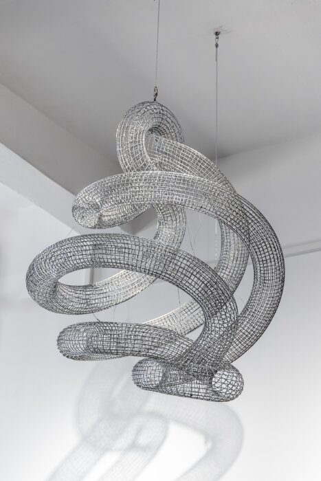 The yurt also inspired architect, sculptor, and inventor Saken Narynov (1936–2023), whose experimental architectural project Mobile Unit (1979) is exhibited in the same room as Maslov’s work. It presents a mobile space residential unit, from which modular building-transformers can be assembled. This unit can be used for various purposes, such as a dwelling for cattle breeders in distant pastures, for geologists, or colonizers of other planets. Narynov received a patent for this invention in 1981 and never abandoned the idea of realizing it. In his practice, Narynov sought to connect art, architecture, and science in a fundamental way, creating spatial structures that span from architectural projects to public art (Fig. 7). Interested in non-Euclidean geometry, the topology of space, and quantum physics, Narynov created objects like the “Möbius Strip” or the “Klein Bottle” from metal wire. Two of these topological developments, or “Top-Art,” titled Six Lives of One Soul (1990) and The End of the Beginning or the Beginning of the End (2001), are exhibited near his Mobile Unit (Fig. 8).